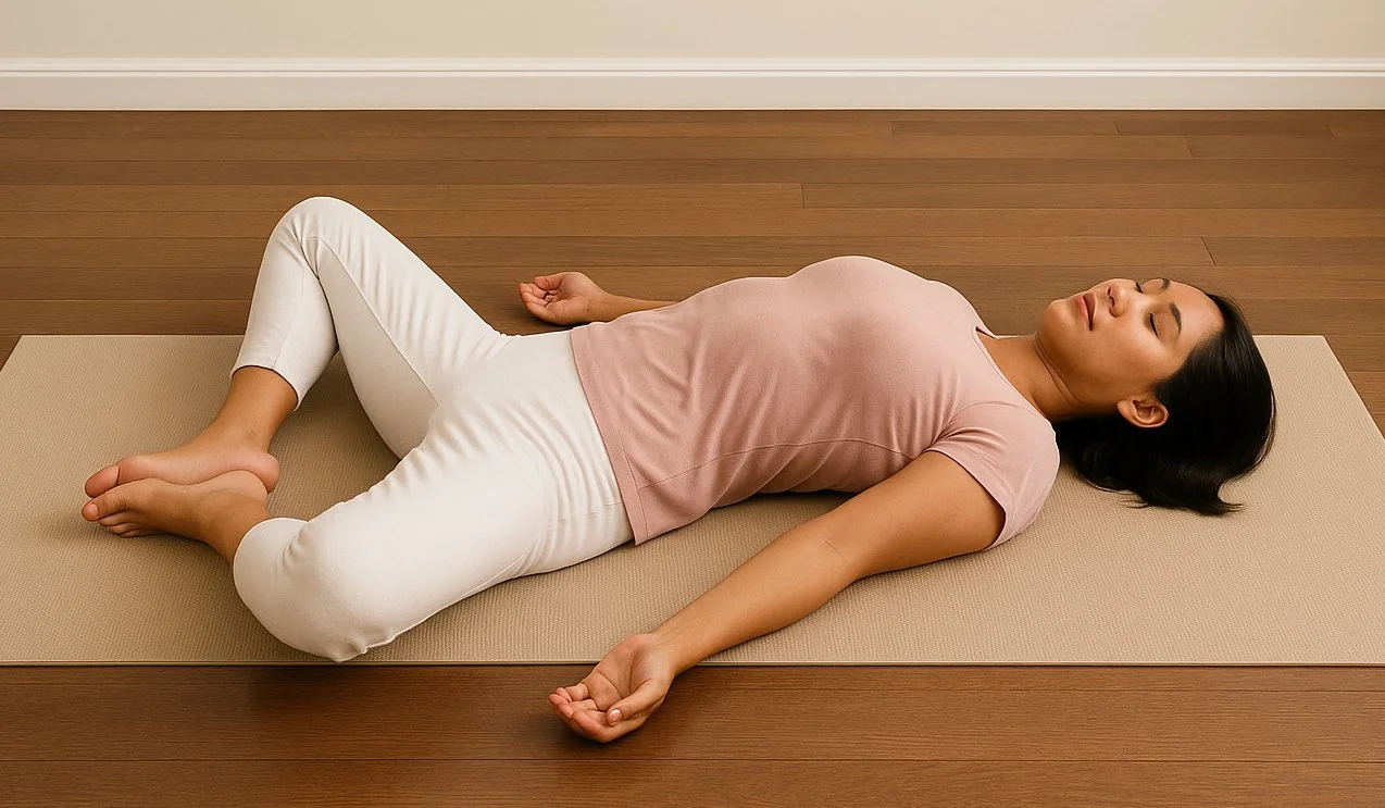 Now lay down - on your back with the soles of your feet together and your legs are open like a butterfly, allowing your knees to hang down naturally.